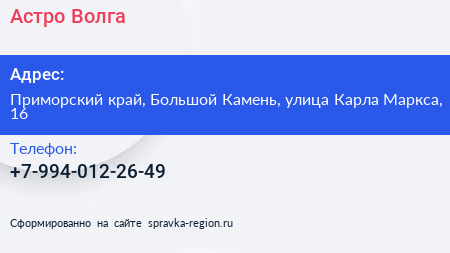 Астро-Волга по адресу Приморский край, Большой Камень, улица Карла Маркса, 16 в дальнейшем Организация, размещена в следующих категориях: