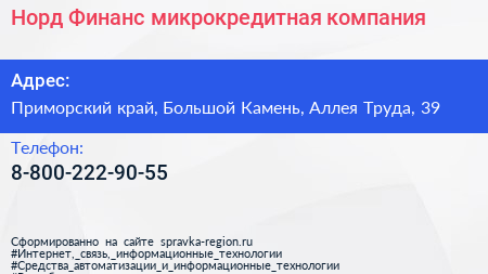Норд Финанс, микрокредитная компания по адресу Приморский край, Большой Камень, Аллея Труда, 39 в дальнейшем Организация, размещена в следующих категориях: