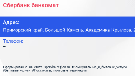 Сбербанк, банкомат по адресу Приморский край, Большой Камень, Академика Крылова, 2 в дальнейшем Организация, размещена в следующих категориях: