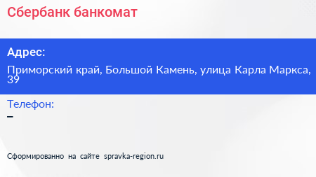 Сбербанк, банкомат по адресу Приморский край, Большой Камень, улица Карла Маркса, 39 в дальнейшем Организация, размещена в следующих категориях: