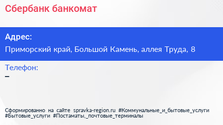 Сбербанк, банкомат по адресу Приморский край, Большой Камень, аллея Труда, 8 в дальнейшем Организация, размещена в следующих категориях: