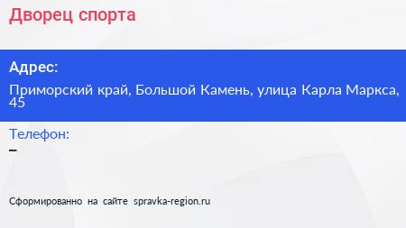 Дворец спорта по адресу Приморский край, Большой Камень, улица Карла Маркса, 45 в дальнейшем Организация, размещена в следующих категориях: