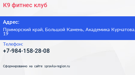 К9, фитнес-клуб по адресу Приморский край, Большой Камень, Академика Курчатова, 19 в дальнейшем Организация, размещена в следующих категориях: