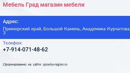 Мебель Град, магазин мебели по адресу Приморский край, Большой Камень, Академика Курчатова, 3 в дальнейшем Организация, размещена в следующих категориях: