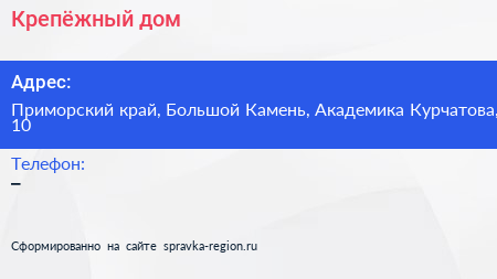 Крепёжный дом по адресу Приморский край, Большой Камень, Академика Курчатова, 10 в дальнейшем Организация, размещена в следующих категориях: