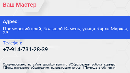 Ваш Мастер по адресу Приморский край, Большой Камень, улица Карла Маркса, 39 в дальнейшем Организация, размещена в следующих категориях:
