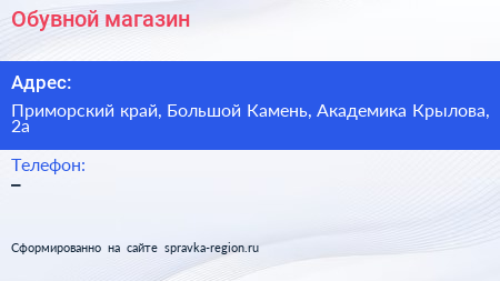 Обувной магазин по адресу Приморский край, Большой Камень, Академика Крылова, 2а в дальнейшем Организация, размещена в следующих категориях: