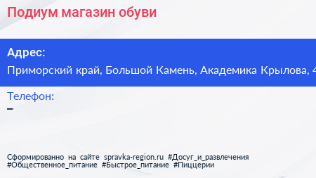 Подиум, магазин обуви по адресу Приморский край, Большой Камень, Академика Крылова, 4 в дальнейшем Организация, размещена в следующих категориях: