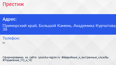 Престиж по адресу Приморский край, Большой Камень, Академика Курчатова, 36 в дальнейшем Организация, размещена в следующих категориях: