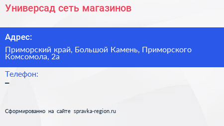 Универсад, сеть магазинов по адресу Приморский край, Большой Камень, Приморского Комсомола, 2а в дальнейшем Организация, размещена в следующих категориях: