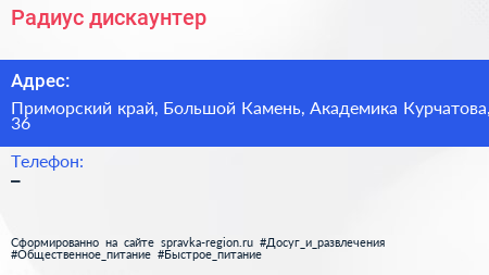 Радиус, дискаунтер по адресу Приморский край, Большой Камень, Академика Курчатова, 36 в дальнейшем Организация, размещена в следующих категориях: