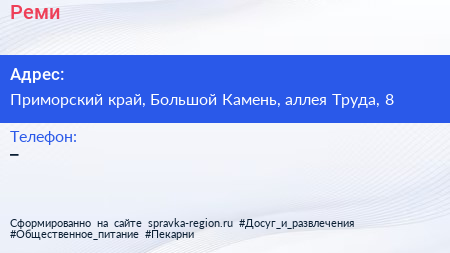 Реми по адресу Приморский край, Большой Камень, аллея Труда, 8 в дальнейшем Организация, размещена в следующих категориях:
