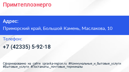 Примтеплоэнерго по адресу Приморский край, Большой Камень, Маслакова, 10 в дальнейшем Организация, размещена в следующих категориях: