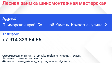 Лесная заимка, шиномонтажная мастерская по адресу Приморский край, Большой Камень, Колхозная улица, 2 в дальнейшем Организация, размещена в следующих категориях: