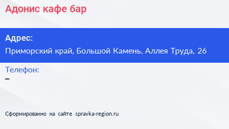 Адонис, кафе-бар по адресу Приморский край, Большой Камень, Аллея Труда, 26 в дальнейшем Организация, размещена в следующих категориях: