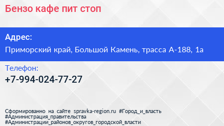 Бензо-кафе, пит-стоп по адресу Приморский край, Большой Камень, трасса А-188, 1а в дальнейшем Организация, размещена в следующих категориях: