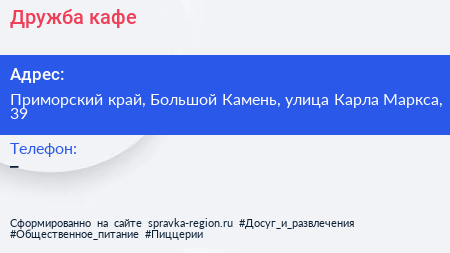 Дружба, кафе по адресу Приморский край, Большой Камень, улица Карла Маркса, 39 в дальнейшем Организация, размещена в следующих категориях: