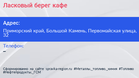 Ласковый берег, кафе по адресу Приморский край, Большой Камень, Первомайская улица, 32 в дальнейшем Организация, размещена в следующих категориях: