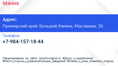 Манна по адресу Приморский край, Большой Камень, Маслакова, 1Б в дальнейшем Организация, размещена в следующих категориях: