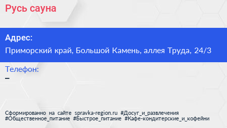 Русь, сауна по адресу Приморский край, Большой Камень, аллея Труда, 24/3 в дальнейшем Организация, размещена в следующих категориях: