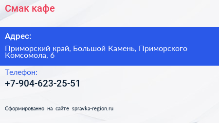Смак, кафе по адресу Приморский край, Большой Камень, Приморского Комсомола, 6 в дальнейшем Организация, размещена в следующих категориях: