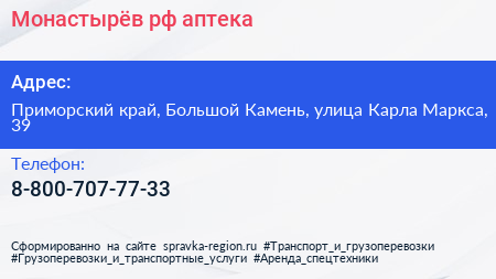 Монастырёв.рф, аптека по адресу Приморский край, Большой Камень, улица Карла Маркса, 39 в дальнейшем Организация, размещена в следующих категориях: