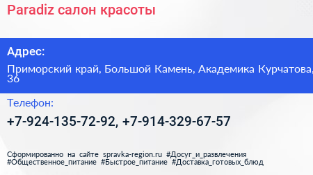 Paradiz, салон красоты по адресу Приморский край, Большой Камень, Академика Курчатова, 36 в дальнейшем Организация, размещена в следующих категориях: