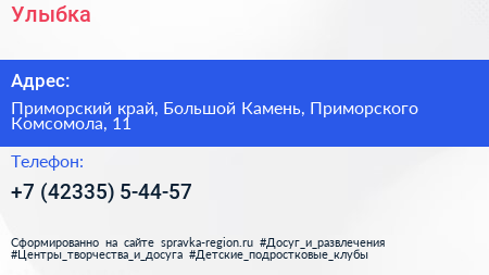 Улыбка по адресу Приморский край, Большой Камень, Приморского Комсомола, 11 в дальнейшем Организация, размещена в следующих категориях: