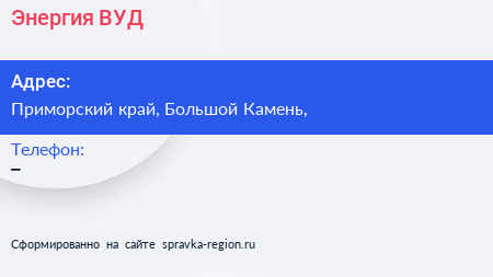 Энергия ВУД по адресу Приморский край, Большой Камень, в дальнейшем Организация, размещена в следующих категориях: