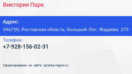 Виктория Парк по адресу 346710, Ростовская область, Большой Лог, Фадеева, 273 в дальнейшем Организация, размещена в следующих категориях: