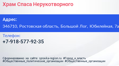 Храм Спаса Нерукотворного по адресу 346710, Ростовская область, Большой Лог, Юбилейная, 7а в дальнейшем Организация, размещена в следующих категориях: