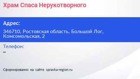 Храм Спаса Нерукотворного по адресу 346710, Ростовская область, Большой Лог, Комсомольская, 2 в дальнейшем Организация, размещена в следующих категориях: