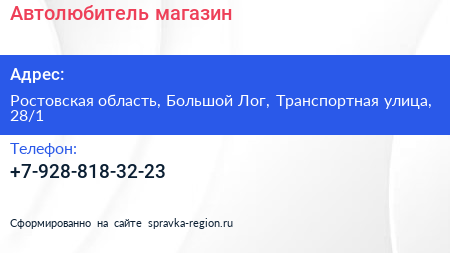 Автолюбитель, магазин по адресу Ростовская область, Большой Лог, Транспортная улица, 28/1 в дальнейшем Организация, размещена в следующих категориях: