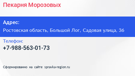 Пекарня Морозовых по адресу Ростовская область, Большой Лог, Садовая улица, 36 в дальнейшем Организация, размещена в следующих категориях: