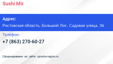 Sushi Mir по адресу Ростовская область, Большой Лог, Садовая улица, 36 в дальнейшем Организация, размещена в следующих категориях: