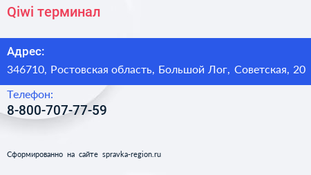 Qiwi, терминал по адресу 346710, Ростовская область, Большой Лог, Советская, 20 в дальнейшем Организация, размещена в следующих категориях: