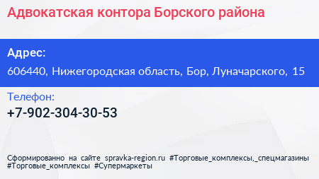 Адвокатская контора Борского района по адресу 606440, Нижегородская область, Бор, Луначарского, 15 в дальнейшем Организация, размещена в следующих категориях:
