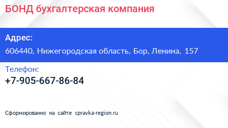 БОНД, бухгалтерская компания по адресу 606440, Нижегородская область, Бор, Ленина, 157 в дальнейшем Организация, размещена в следующих категориях:
