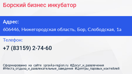 Борский бизнес-инкубатор по адресу 606446, Нижегородская область, Бор, Слободская, 1а в дальнейшем Организация, размещена в следующих категориях: