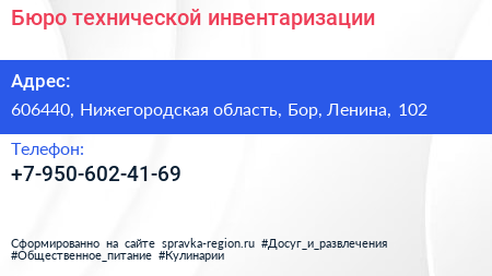 Бюро технической инвентаризации по адресу 606440, Нижегородская область, Бор, Ленина, 102 в дальнейшем Организация, размещена в следующих категориях:
