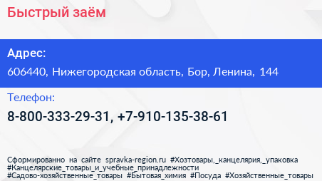 Быстрый заём по адресу 606440, Нижегородская область, Бор, Ленина, 144 в дальнейшем Организация, размещена в следующих категориях: