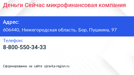 Деньги Сейчас, микрофинансовая компания по адресу 606440, Нижегородская область, Бор, Пушкина, 97 в дальнейшем Организация, размещена в следующих категориях: