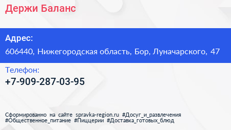 Держи Баланс по адресу 606440, Нижегородская область, Бор, Луначарского, 47 в дальнейшем Организация, размещена в следующих категориях: