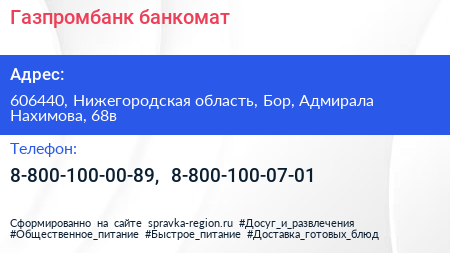 Газпромбанк, банкомат по адресу 606440, Нижегородская область, Бор, Адмирала Нахимова, 68в в дальнейшем Организация, размещена в следующих категориях: