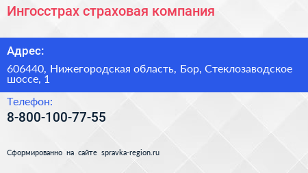 Ингосстрах, страховая компания по адресу 606440, Нижегородская область, Бор, Стеклозаводское шоссе, 1 в дальнейшем Организация, размещена в следующих категориях: