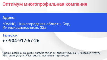 Оптимум, многопрофильная компания по адресу 606440, Нижегородская область, Бор, Интернациональная, 32а в дальнейшем Организация, размещена в следующих категориях: