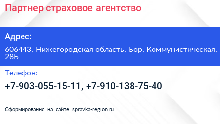 Партнер, страховое агентство по адресу 606443, Нижегородская область, Бор, Коммунистическая, 28Б в дальнейшем Организация, размещена в следующих категориях: