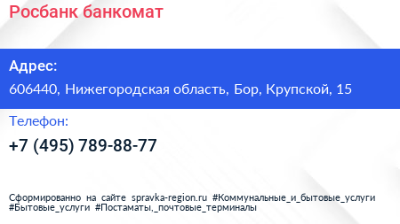 Росбанк, банкомат по адресу 606440, Нижегородская область, Бор, Крупской, 15 в дальнейшем Организация, размещена в следующих категориях: