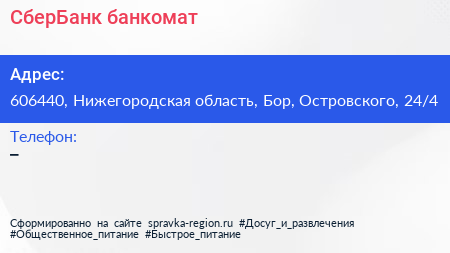СберБанк, банкомат по адресу 606440, Нижегородская область, Бор, Островского, 24/4 в дальнейшем Организация, размещена в следующих категориях: