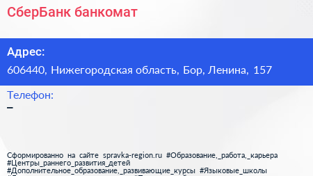 СберБанк, банкомат по адресу 606440, Нижегородская область, Бор, Ленина, 157 в дальнейшем Организация, размещена в следующих категориях: